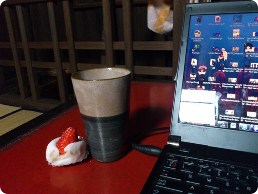 Home from sushi, Reiko gave me a dessert to munch on in my room. This is ichigo daifuku (いちご大福). It’s a soft rice cake filled with anko (sweet bean paste), in this case white, and with a strawberry. Don’t be fooled, this too is really good!